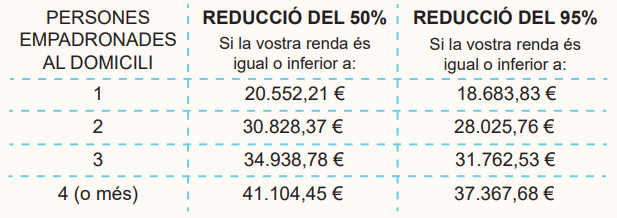 Exemple: si els vostres ingressos anuals durant el 2025 han sigut 29.000 € i viviu 2 persones, teniu una reducció del 50%. Si sou tres, del 95 %.