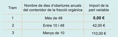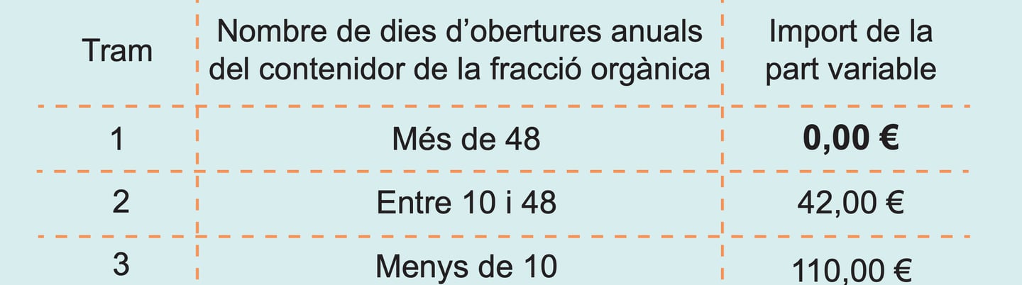 Es determinarà en funció del nombre de vegades que s’hagi obert el contenidor de la fracció orgánica durant tot l’any 2026. Es cobrarà el 2027. L’import de la part variable del 2025, que s’havia de cobrar el 2026, no es cobrarà.